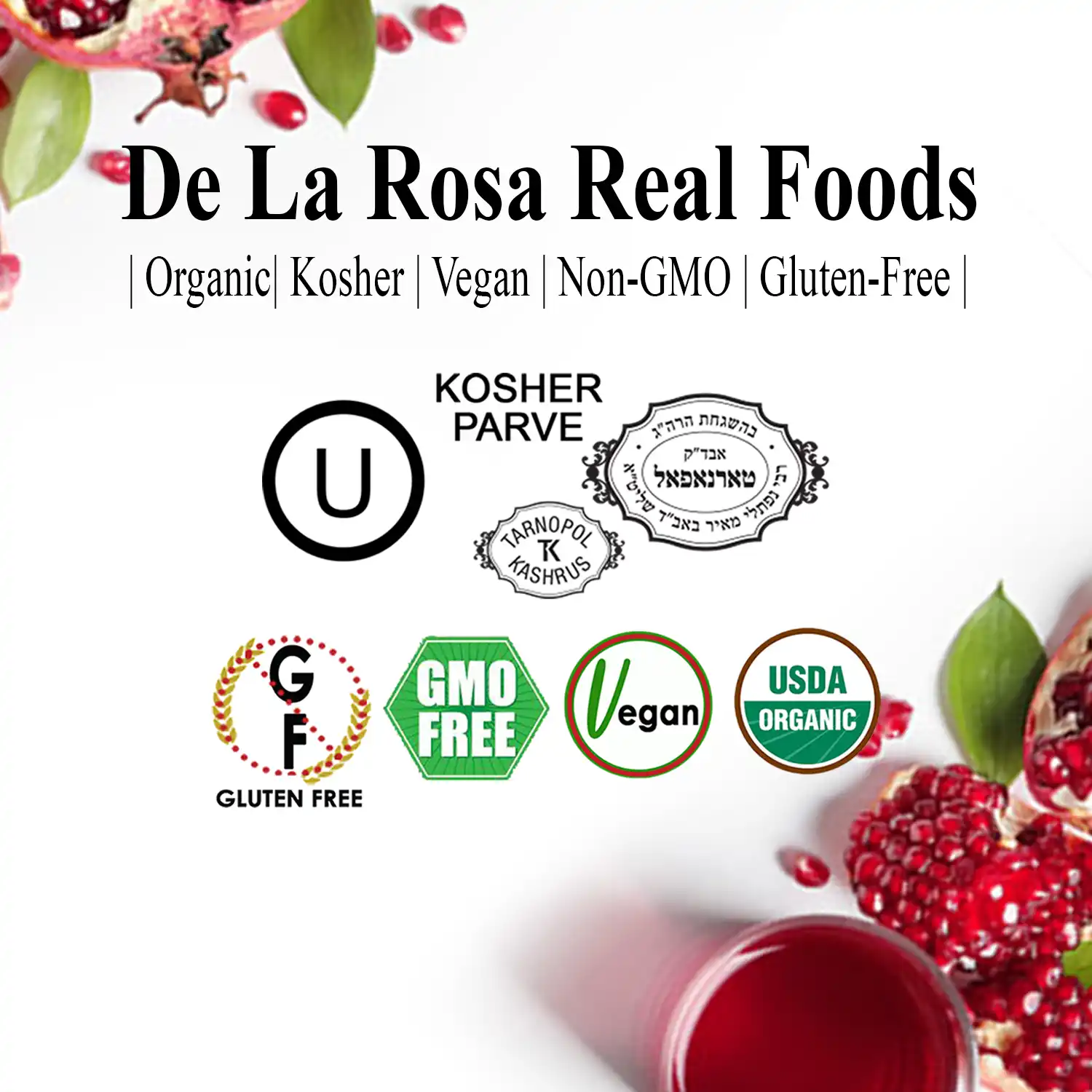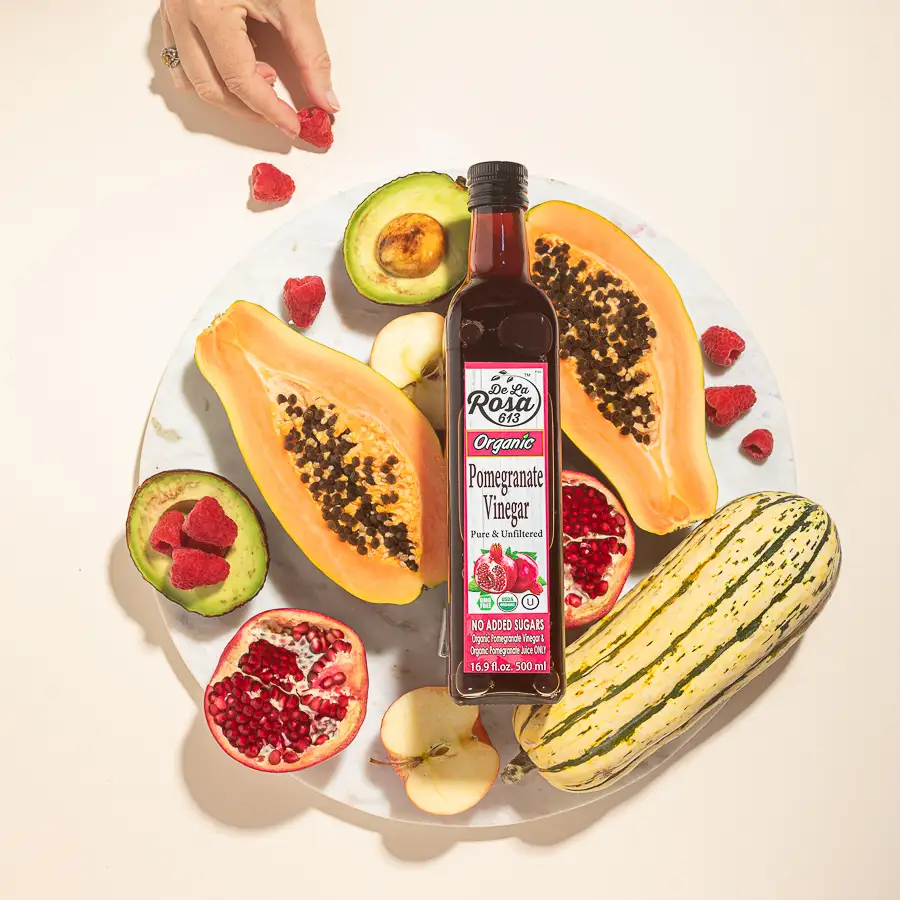 De La Rosa Organic Pomegranate Vinegar is made from delicious healthy organically grown pomegranates. Our 100% organic pomegranates are untouched by chemicals or sprays and our vinegar has NO ADDITIVES or Preservatives NO water No sugar nothing is added ever. Organic Pomegranate Vinegar is perfect for fish & poultry as an ingredient in salad dressing, dips, and marinades.